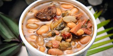 Tender Navy Beans, chunks of Smoked Ham and Mojo Pork, Chorizo, Collard Greens and Garlic make this savory soup fine enough to bear our name!